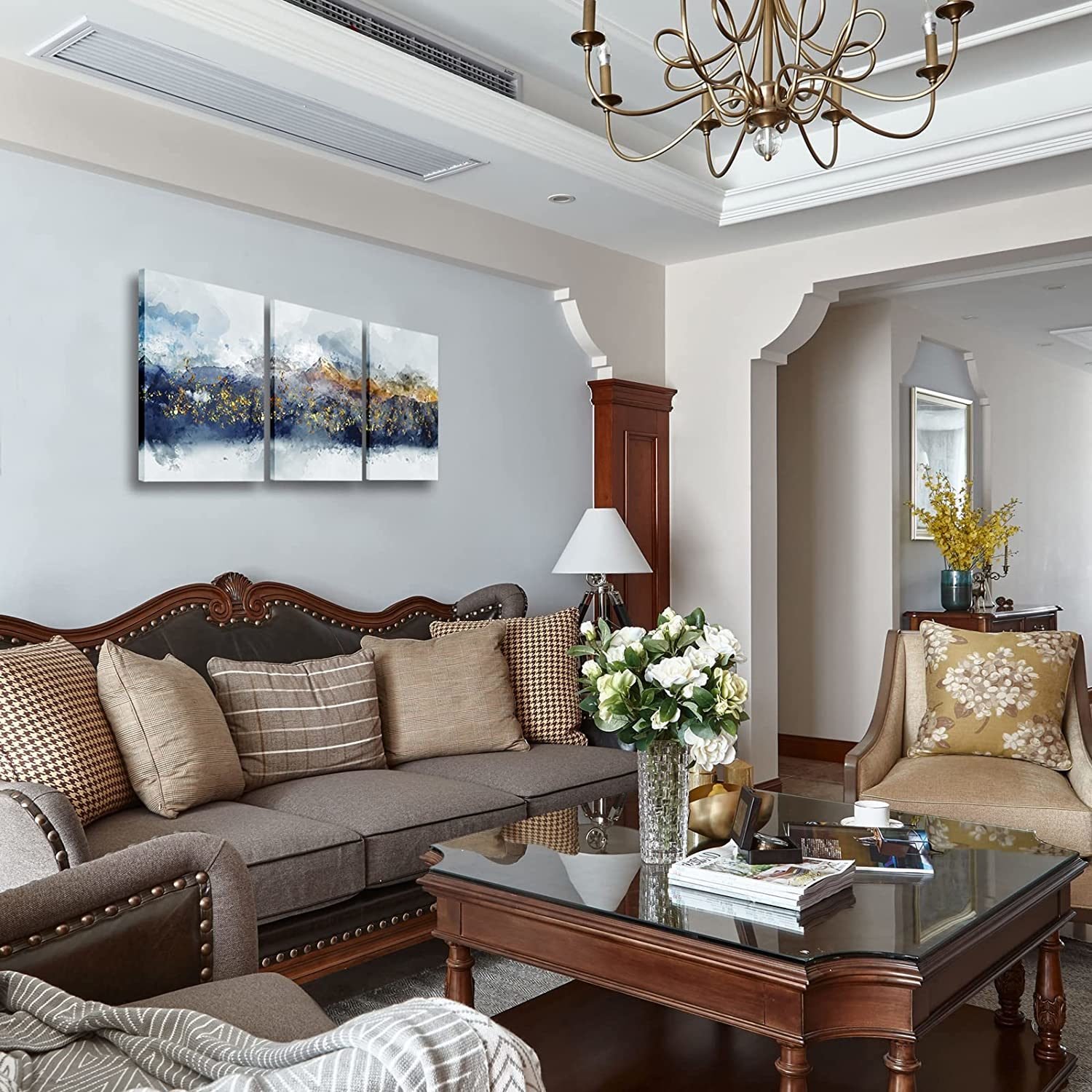 2.Easy to Hang: Gold and navy blue decor living room,stretched and framed canvas art prints ready to hang for home wall decorations.Each panel has a black hook already mounted on the wooden.We give a gifts Hanging nail,avoid damage the wall.