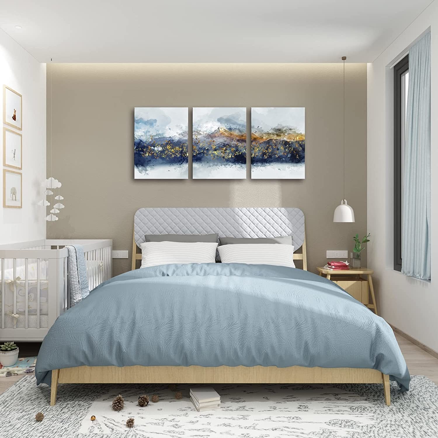 3.Abstract Mountain Wall Paintings Size: 12x16inchx3pcs(30x40cmx3pcs).Packing in carton box,abstract wall art blue and gold.