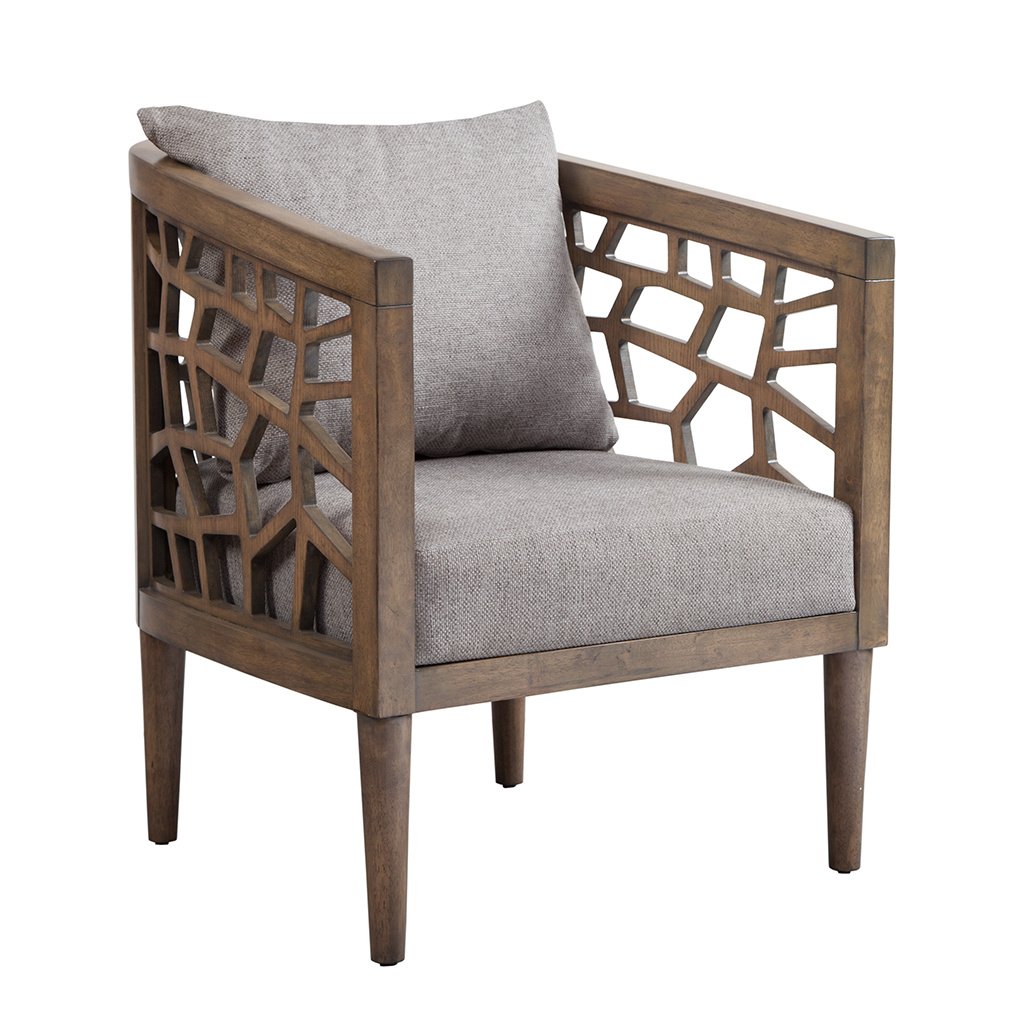 DescriptionDress up your decor with mid-century style of the INK+IVY Crackle Accent Chair. Highlighted in a natural carmel oak finish, this accent chair features light grey hued upholstery that creates a stunning contrast. The seat and back is filled with high-density foam filling for exceptional comfort, while the solid wood frame provides long-lasting support. Incorporate this lounge chair into your living room to add a stylish flair to your space. Leg assembly is required.Product DetailsSee below1 Accent Chair:27"W x 29"D x 32.5"HSeat Dimension:23.25"W x 28"D x 18"HPillow:24"W x 24"HSeat Cushion Thickness:6"Seat Height from Ground:18"HBack Rest:17.25"W x 14.5"HArms:29.25"W x 27.75"HLeg Size:2.25"W x 2.25"DLeg Height:10"Distance Between Legs(Front to Front):23"Distance Between Legs(Back to Back):18"Distance Between Legs(Front to Back):20"Maximum Weight Capacity:300 LBSMaterialMaterial: Solid wood and plywood frame; Solid wood legs; Upholstered seat and backFabrication: 85% polyester, 15% acrylicFilling: High density foamWood Finish: Carmel oak