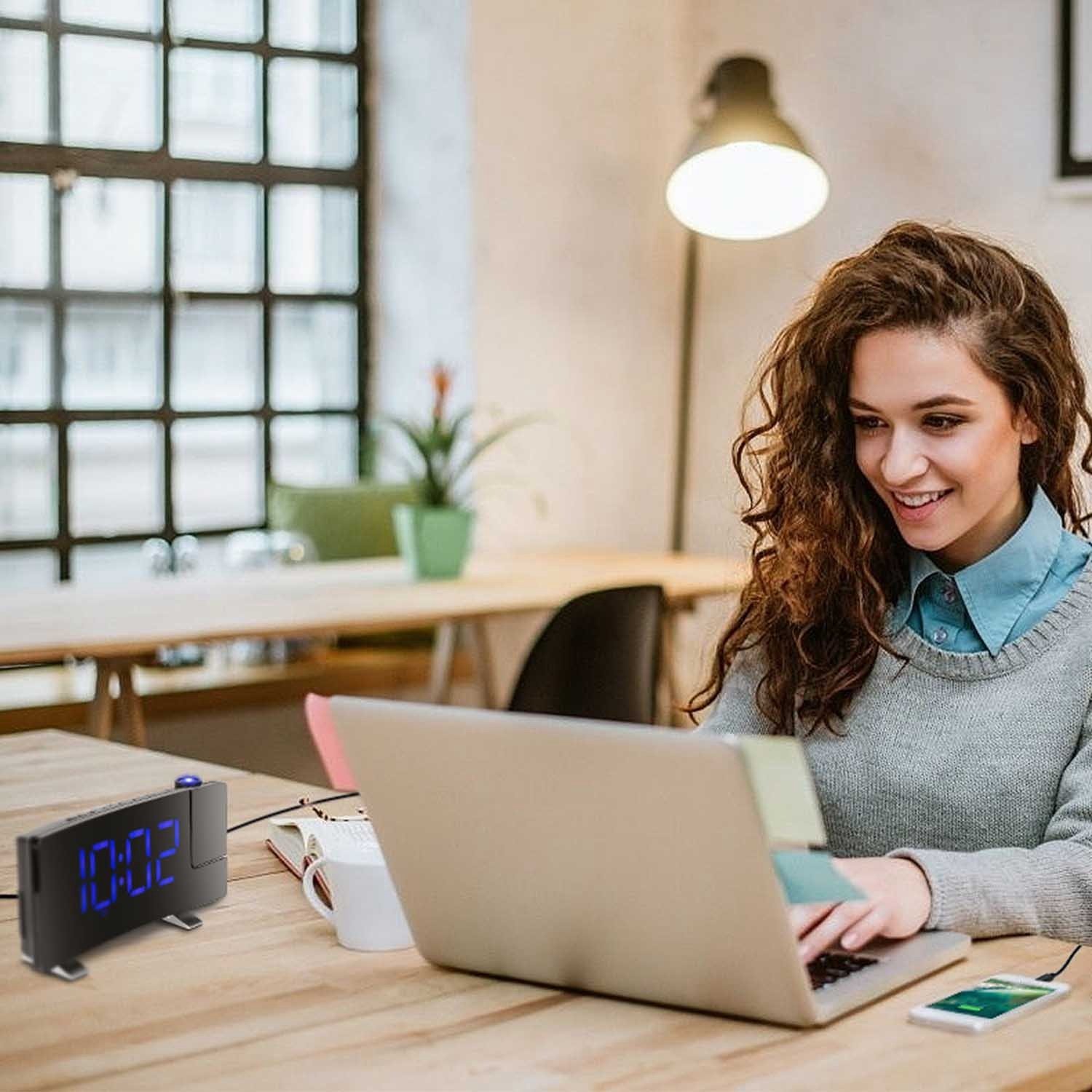 Projection Alarm Clock with Radio Function 7.7In Curved-Screen LED Digital Alarm Clock w/ Dual Alarms 4 Dimmer 12/24 Hour